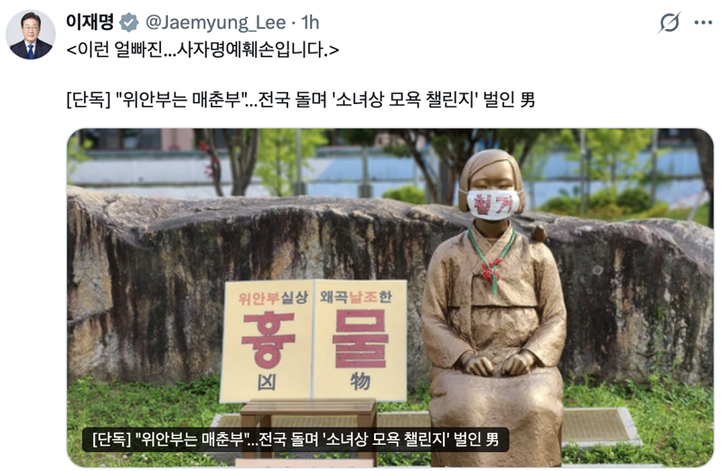 [파이낸셜뉴스] 전국을 돌며 일본군 위안부 피해자들을 성매매 여성으로 비난하며 '평화의 소녀상' 철거를 요구하는 시위를 벌인 극우 성향 시민단체 대표 등에 대해 이재명 대통령이 6일 "얼빠진 사자명예훼손"이라며 강하게 비판했다.