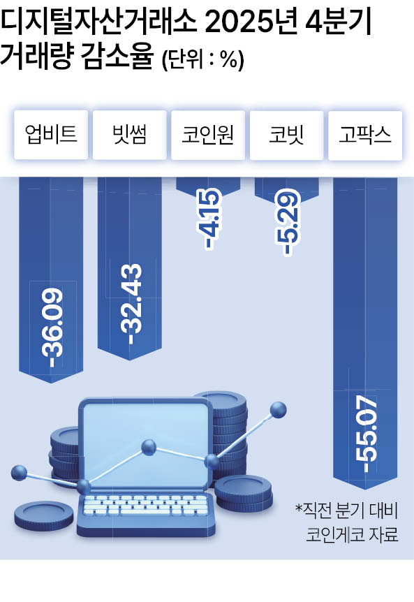 비트코인이 지난해 10~12월 연속 하락하면서, 국내 거래소 거래량이 평균 26% 급감했다. 4분기 내내 하락한 건 7년 만으로, 거래량이 매출과 직결되는 거래소 구조상 혹독한 한파를 겪은 것이다.