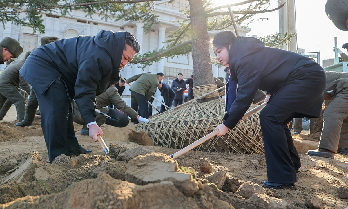 김정은 국무위원장이 5일 평양에 들어설 러시아 파병군 추모기념관 건설현장을 찾아 딸 주애와 함께 기념식수를 위해 삽을 들고 땅을 파고 있다. 평양 노동신문·뉴스1 |