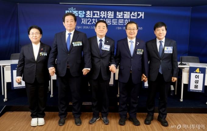 (서울=뉴스1) 이승배 기자 = 더불어민주당 최고위원 보궐선거에 출마한 문정복, 유동철, 강득구, 이건태, 이성윤 후보가 5일 오전 서울 여의도 더불어민주당 당사에서 열린 최고위원 보궐선거 제2차 합동토론회에 앞서 선전을 기원하며 기념촬영을 하고 있다. (공동취재) 2026.1.5/뉴스1 Copyright (C) 뉴스1. All rights reserved. 무단 전재 및 재배포, AI학습 이용 금지. /사진=(서울=뉴스1) 이승배 기자 |