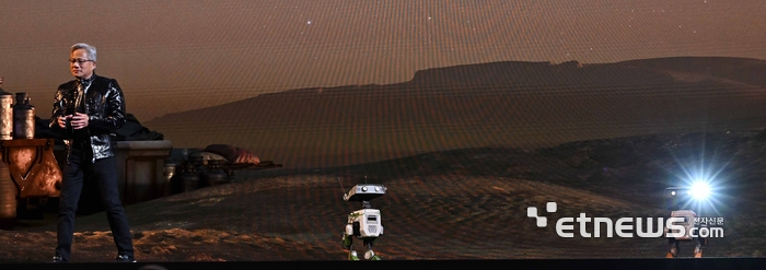 젠슨 황 엔비디아 CEO가 5일(현지시간) 미국 네바다주 라스베이거스 퐁텐블로 호텔에서 열린 엔비디아 CES 2026 라이브에서 특별연설을 하고 있다. 라스베이거스=이동근기자 foto@etnews.com |