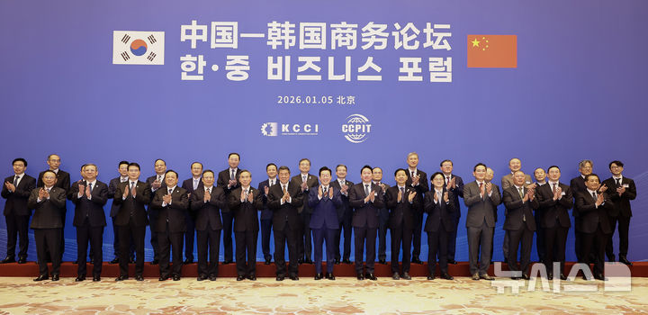 [베이징=뉴시스] 최동준 기자 = 중국을 국빈 방문 중인 이재명 대통령이 5일(현지 시간) 베이징 조어대에서 열린 한중 비즈니스 포럼 사전 간담회에서 허리펑 경제담당 부총리 등 참석자들과 기념촬영을 하고 있다.앞줄 왼쪽부터 후치쥔 중국석유화공 회장, 옌둥 상무부 부부장, 쑨 웨이동 외교부 부부장, 다이빙 주한중국대사, 런홍빈 CCPIT 회장, 허 부총리, 이 대통령, 최태원 대한상공회의소 회장, 구윤철 경제부총리 겸 재정경제부 장관, 김정관 산업통상부 장관, 이재용 삼성전자 회장, 정의선 현대차그룹 회장, 구광모 LG그룹 회장, 장인화 포스코홀딩스 회장.뒷줄 왼쪽부터 왕젠요우 LANCY 회장, 리우융 텐센트 부회장, 쉬쯔양 ZTE 회장, 장정핑 SERES 회장, 장나이원 짱쑤위에다 회장, 청위친 CATL 회장, 리둥성 TCL 회장, 니전 중국에너지건설 회장, 랴오린 중국공상은행 회장, 조현 외교부 장관, 김용범 정책실장, 위성락 안보실장, 노재헌 주중대사, 허태수 GS그룹 회장, 손경식 CJ그룹 회장, 구자은 LS홀딩스 회장, 최병오 패션그룹형지 회장, 장철혁 SM엔터 대표, 김창한 크래프톤 대표. 2026.01.05. photocdj@newsis.com |