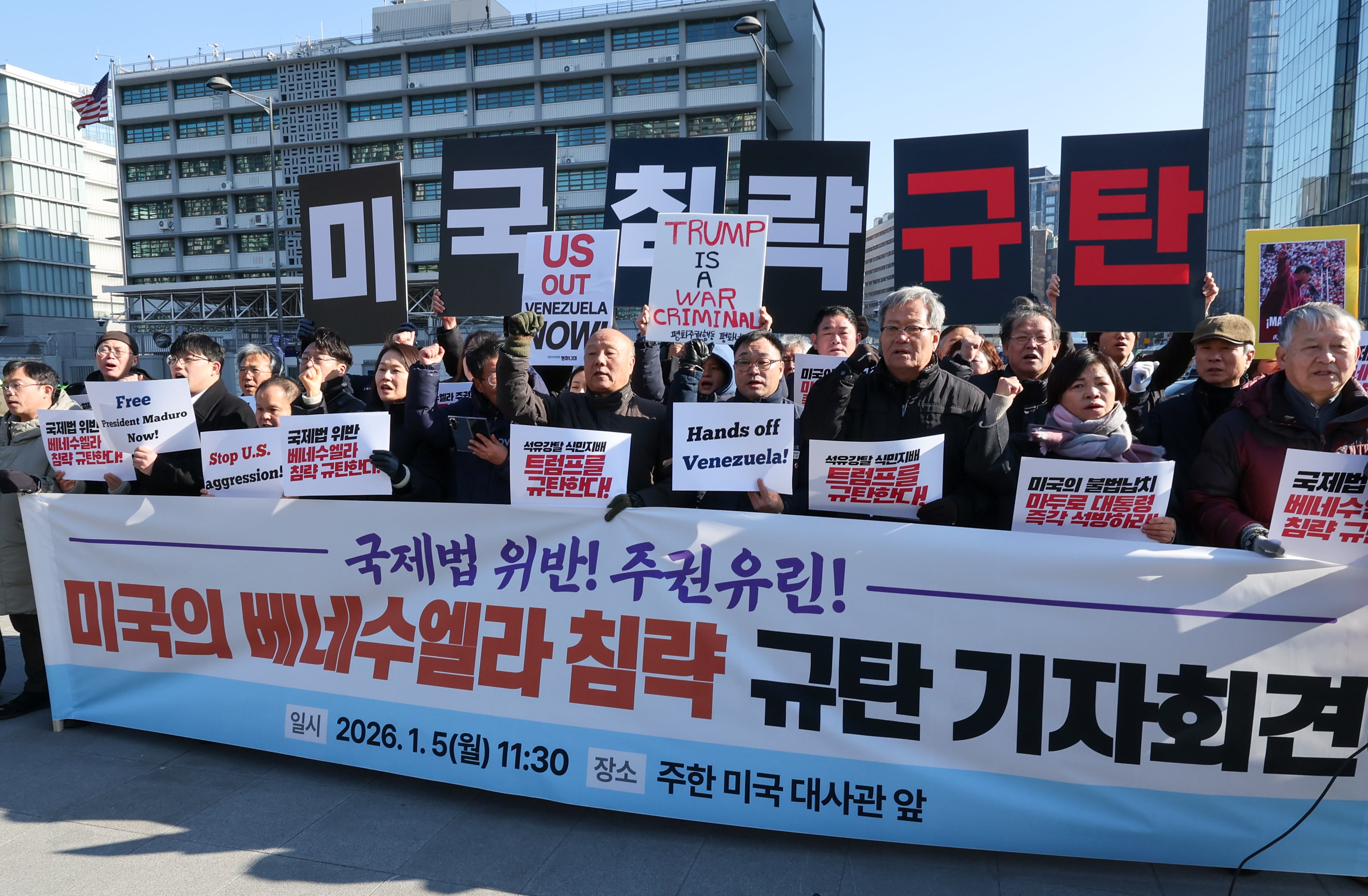 박 대표는 이날 오전 서울 종로구 주한 미국 대사관 앞에서 열린 ‘국제법 위반! 주권 유린! 미국의 베네수엘라 침략 규탄 기자회견’에 참석했다. 이날 기자회견은 진보당과 전국민중행동, 자주통일평화연대 등 267개 사회 단체가 참여한 ‘트럼프위협저지공동행동’이 주최했다.