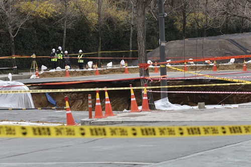 30대 오토바이 운전자의 목숨을 앗아간 대형 싱크홀(땅 꺼짐)이 발생한 서울 강동구 명일동은 2년 전 서울시 용역 보고서에서 '요주의 지역'으로 꼽힌 것으로 나타났다. 28일 더불어민주당 박용갑 의원실이 서울시로부터 제출받은 '서울도시철도 9호선 4단계 연장사업 건설공사 지하 안전영향평가 용역' 보고서에 따르면 사고 발생 지점 인근은 지반이 연약하고 침하량이 큰 것으로 분석됐다. 사진은 이날 명일동 사고 현장. 2025.3.28 [연합뉴스 자료사진] |