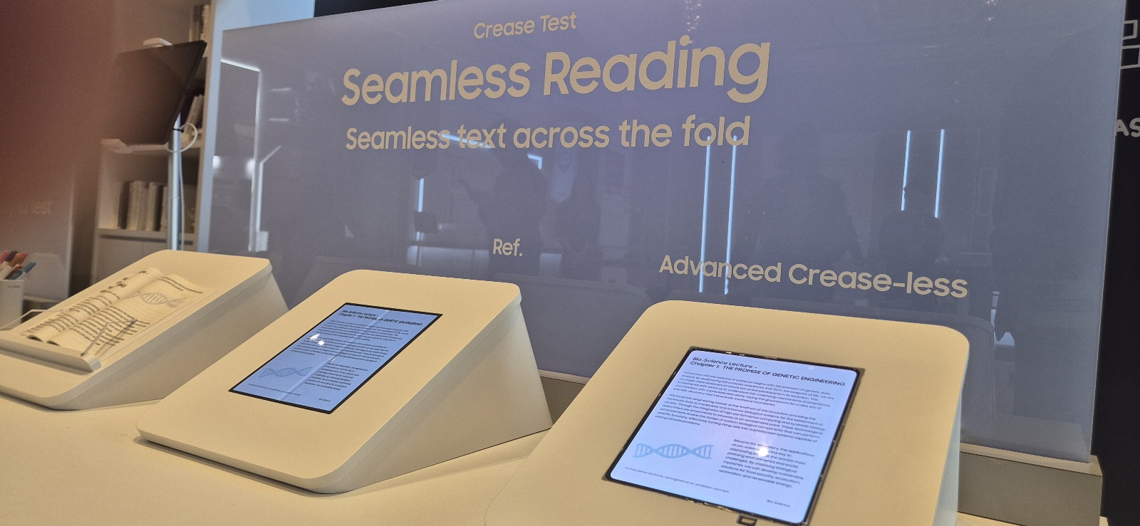 이날 삼성디스플레이의 공개 제품 중 가장 눈길을 끈 건 접히는 디스플레이 주름을 최소화 한 제품이다. 이번에 공개된 시제품은 접히는 부분의 주름을 육안으로는 찾아보기 힘들 정도로 없애는 데 성공했다. 2025년형 제품과 비교해 주름이 약 20%가량 얕아지면서 시각적 만족도와 터치감을 동시에 끌어올릴 수 있을 거라는 게 삼성디스플레이의 설명이다.