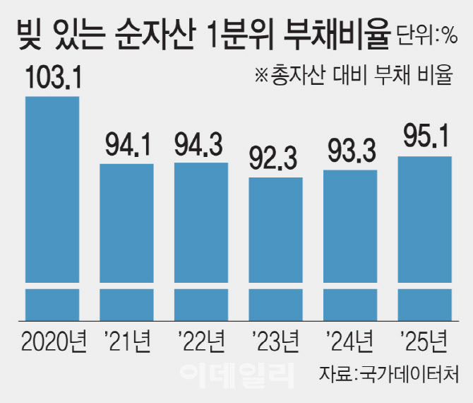 6일 국가데이터처 국가통계포털에 따르면 지난해 부채를 보유한 순자산 1분위(하위 20%) 가구의 평균 자산은 6535만원, 부채는 6216만원으로 자산 대비 부채비율은 95.1%로 조사됐다. 부채비율은 코로나19 사태가 발생한 2020년(103.1%) 이후 최고치다. 2023년 92.3%까지 낮아졌으나 다시 오름세를 나타내고 있다. 순자산 5분위(상위 20%) 가구 부채비율이 2023년 17.1%에서 지난해 16.6%로 낮아진 점과 대조적이다.