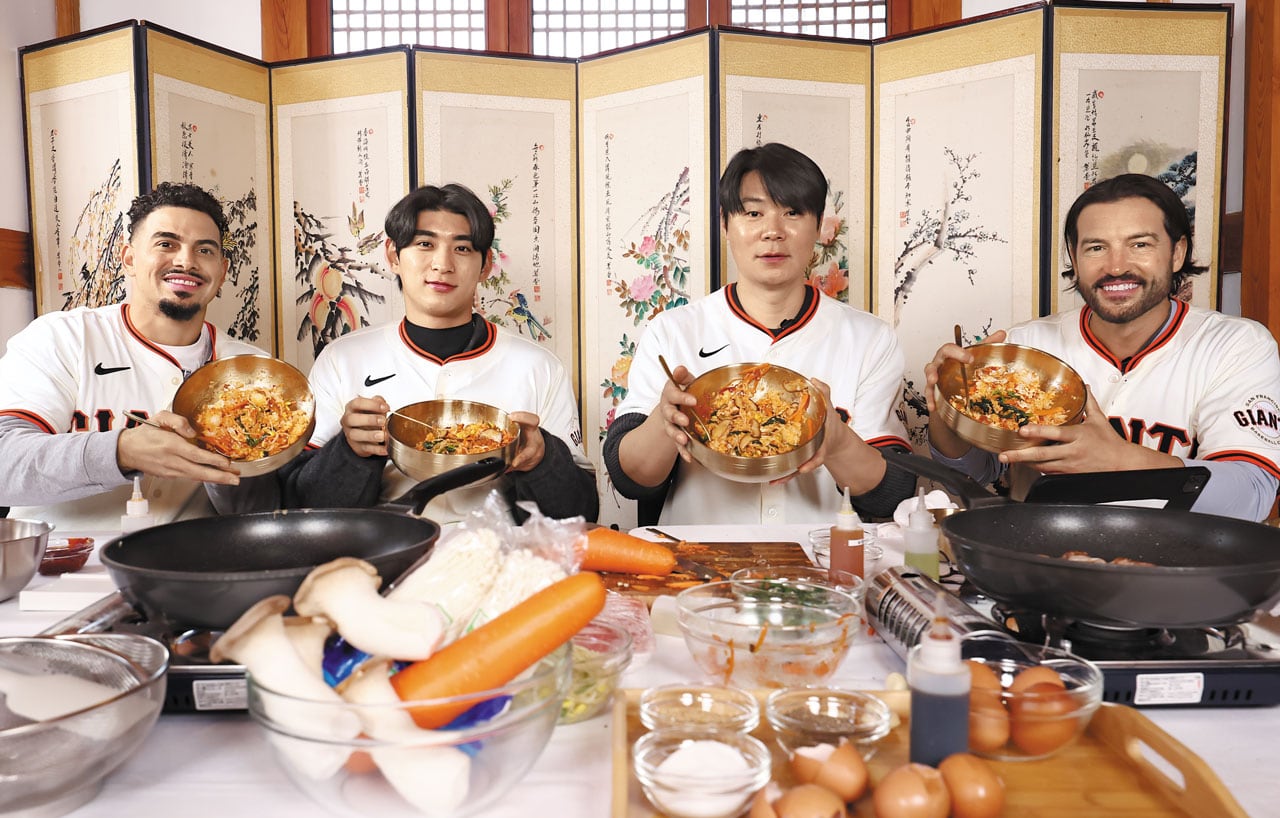 미국 메이저리그(MLB) 샌프란시스코 자이언츠 소속 이정후(왼쪽 둘째)가 한국을 방문한 팀 동료들과 함께 전통 문화 체험에 나섰다. 이정후와 윌리 아다메스(왼쪽), 토니 바이텔로(오른쪽) 자이언츠 감독이 6일 서울 종로구 한옥 공연장에서 최현석 셰프와 함께 만든 비빔밥을 들어 보이고 있다. 자이언츠 구단 측은 “이번 방한은 구단 홍보를 넘어 한국 야구와 문화에 대한 존중, 교류 의지를 보여주기 위한 것”이라고 설명했다. 자이언츠 선수단은 7일엔 국내 고등학생 선수들을 만나 야구 클리닉을 진행할 계획이다.