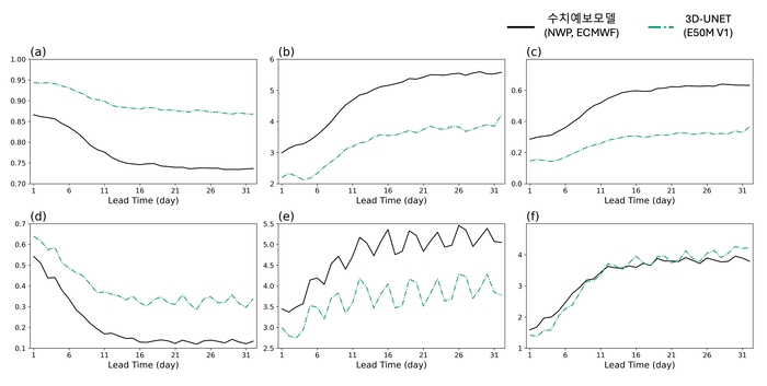 이를 해결하기 위해 날씨가 시간에 따라 어떻게 이어지고 변화하는지를 함께 학습하도록 설계한 '3차원(3D) U-Net 기반 AI 예보후처리 모델'을 개발했다. 이 모델은 오늘부터 예측하려는 날짜까지의 시간 구간(예보 선행시간)을 하나의 연속된 흐름으로 분석해 비교적 정확도가 높은 초단기·중기(1~10일) 예보 정보를 바탕으로 그 이후 연장중기(10~32일) 예보까지 정확도를 자연스럽게 확장하도록 설계했다. 즉 기존 수치예보가 제공하는 정보를 단순히 보정하는 수준을 넘어 시간·공간·지형 특성을 동시에 반영해 더 현실적인 결과를 내도록 만든 것이다.