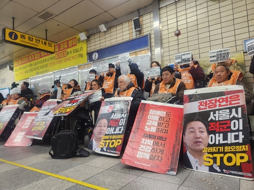 (서울=연합뉴스) 김준태 기자 = 전국장애인차별철폐연대(전장연)가 6월 지방선거까지 지하철 연착을 유발하는 탑승 시위를 멈춘다.