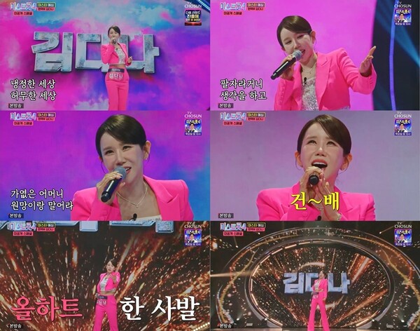 나훈아 원곡의 ‘건배’를 선곡한 김다나는 특유의 흥과 가창력을 바탕으로 분위기를 단숨에 끌어올렸다. 자연스러운 제스처와 능청스러운 표정 연기는 물론, 노련한 가창과 안정적인 음정이 어우러진 무대는 판정단의 호응을 이끌어내며 빠르게 하트 수를 올렸다.