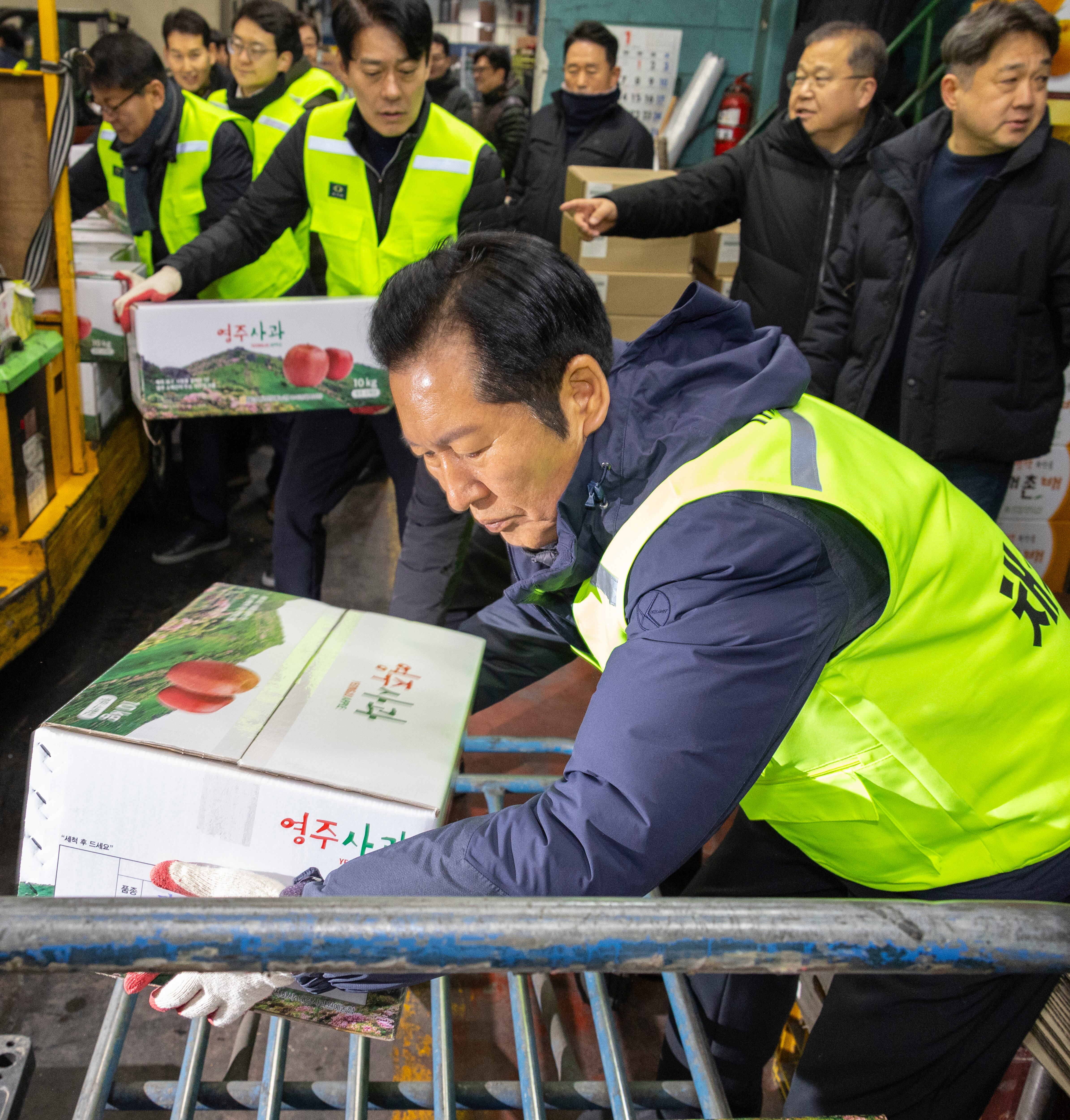 더불어민주당 정청래 대표와 최고위원들이 7일 서울 송파구 가락동농수산물도매시장 중앙청과 내 사과 경매장을 방문해 경매를 마친 사과를 중간 도매인에게 배달하고 있다. /연합뉴스 |