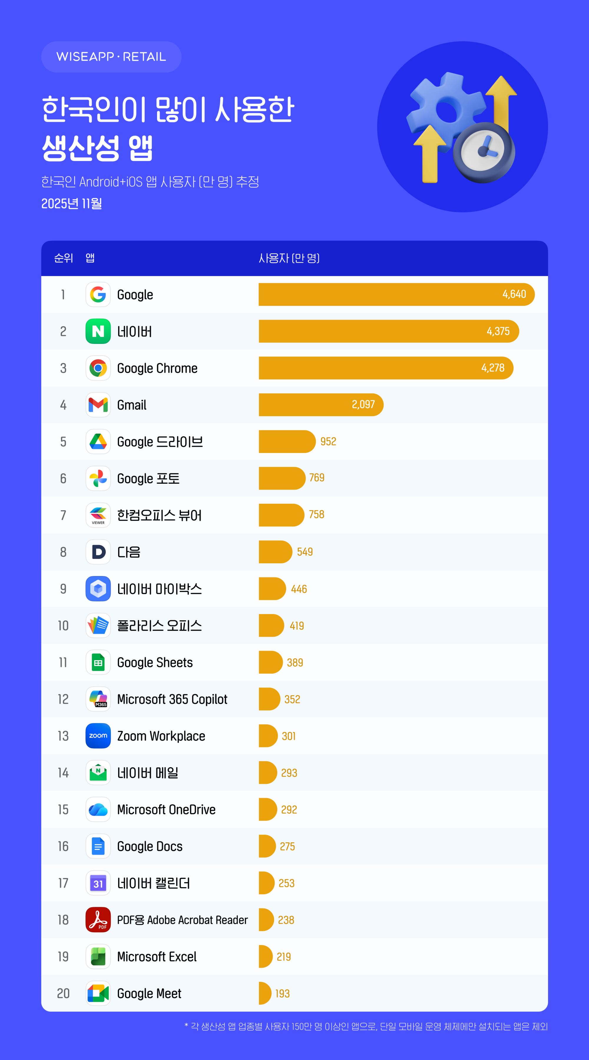 와이즈앱·리테일이 한국인 스마트폰 사용자(안드로이드+iOS)를 대상으로 주요 생산성 앱의 월간활성사용자수(MAU)를 분석한 결과, 지난해 11월 기준 구글이 4640만명으로 1위를 기록했다. 생산성 앱은 개인이나 조직이 업무·학습·일상 활동을 더 효율적으로 수행하도록 돕는 모바일 앱을 의미한다.