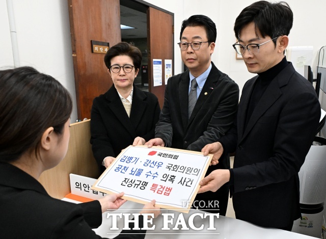 [더팩트ㅣ김수민 기자] 국민의힘이 7일 '김병기·강선우 국회의원의 공천 뇌물 수수 의혹 사건 진상규명 특검법'을 제출했다. 특히 2022년 지방선거 당시 더불어민주당 비상대책위원장이었던 윤호중 행정안전부 장관과 2024년 총선 당시 민주당 대표였던 이재명 대통령에 대한 수사 필요성도 주장했다.