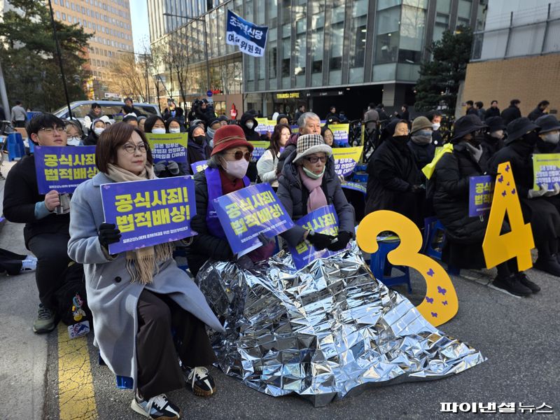 수요시위는 1991년 고(故) 김학순 할머니가 위안부 성노예 피해 사실을 처음 공개 증언한 것을 계기로 이듬해 1월 8일 시작됐다. 이날은 수요시위 34주년을 하루 앞둔 날이자 올해 첫 시위가 벌어진 날이다.