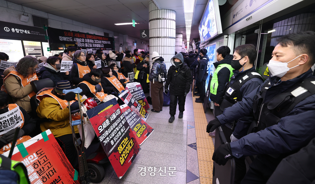 전국장애인차별철폐연대를 비롯한 시민단체 활동가들이 지난 2일 서울 지하철 1호선 시청역에서 장애인 이동권 보장 등을 촉구하는 시위를 하고 있다. 김영배 더불어민주당 의원과 전장연은 오는 6월초까지 시위를 유보하기로 지난 6일 합의했다. 권도현 기자 |