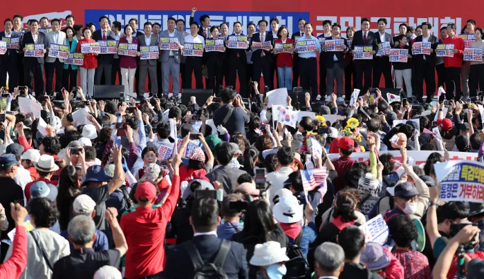 국민의힘 장동혁 대표와 송언석 원내대표 등 국민의힘 관계자들이 지난달 21일 대구 동구 동대구역 광장에서 열린 ‘야당 탄압·독재정치 국민 규탄대회’에 참가해 여당 규탄 피켓을 들고 있다. 연합뉴스 |