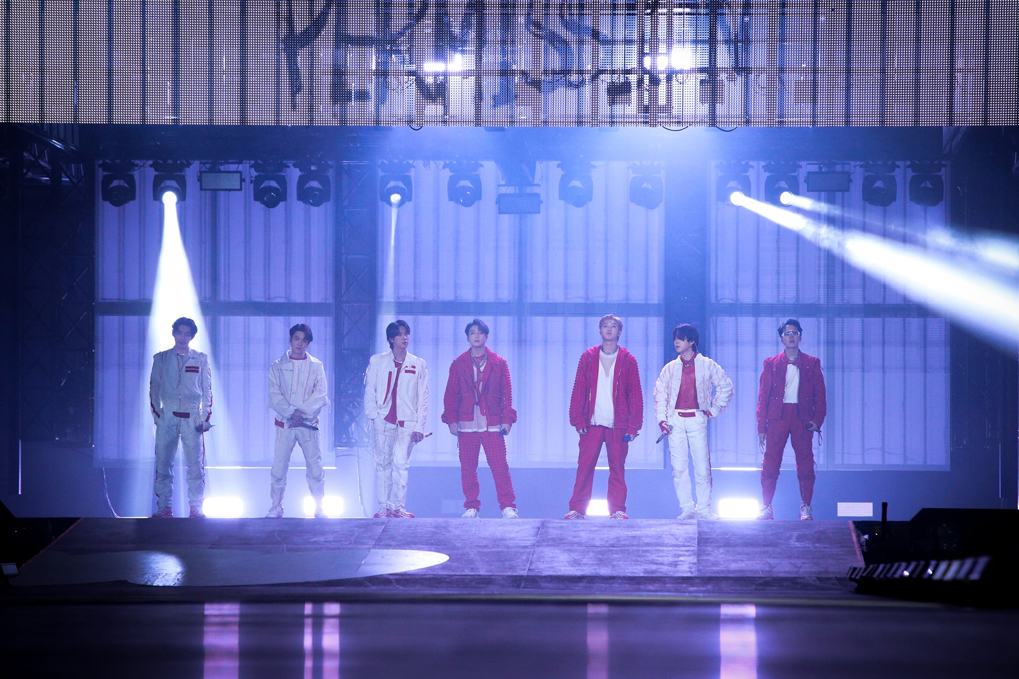 방탄소년단(BTS) 뷔(왼쪽부터), 슈가, 진, 정국, RM, 지민, 제이홉이 지난 2023년 서울 송파구 잠실주경기장에서 열린 'BTS 퍼미션 투 댄스 온 스테이지 - 서울(PERMISSION TO DANCE ON STAGE - SEOUL)' 콘서트에서 화려한 무대를 선보이는 모습. /뉴스1 |