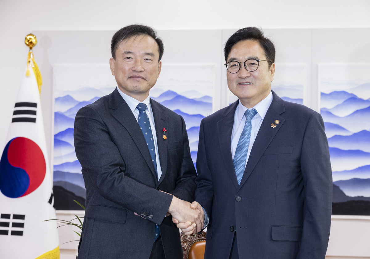 우원식 국회의장(오른쪽)이 8일 취임 인사차 국회를 방문한 김종철 방송미디어통신위원회 위원장을 접견하며 인사하고 있다. 연합뉴스 |