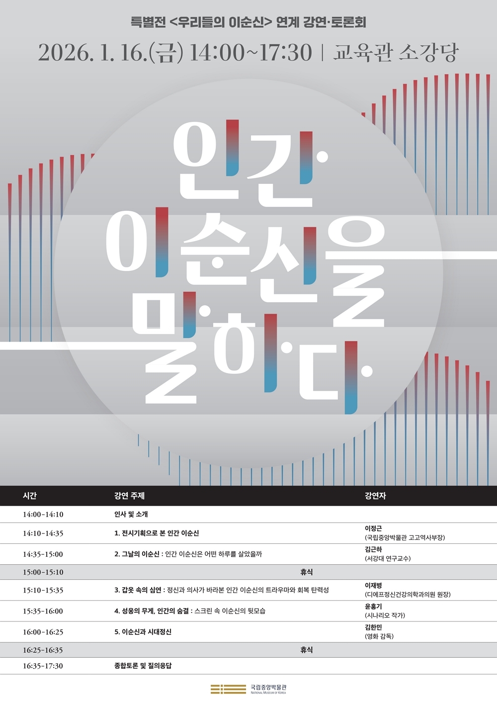 특별전 ‘우리들의 이순신’과 연계해 마련된 자리다. 큐레이터·역사학자·정신건강의학과 전문의·작가·영화감독 등 다양한 분야의 전문가들이 역사적 인물인 이순신을 다각적으로 흥미로운 시선으로 풀어낸다. 성웅이라는 틀에 갇힌 모습이 아닌 이순신의 인간적 면모, 고뇌와 선택 그리고 일상적 모습을 조명해 오늘날을 살아가는 우리와 같은 공감대를 만들어갈 예정이다.