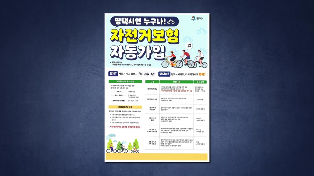 평택시가 시민들이 안심하고 자전거를 탈 수 있도록 '평택시민 자전거 보험'을 갱신하고 본격적인 운영에 들어갔습니다.