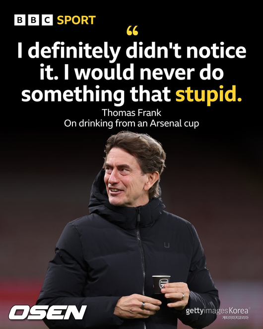 [OSEN=노진주 기자] 토트넘 홋스퍼의 패배보다 더 큰 화제가 된 장면은 경기 전 토마스 프랭크 감독(52)이 ‘아스날 컵'을 들고 있던 순간이다.