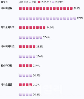 반면 네이버웹툰의 이용률은 81.4%로 전년(87.1%) 대비 5.7%포인트 하락했다. 압도적인 높은 점유율은 유지했지만 독점 강도가 소폭 완화된 모습이었다.
