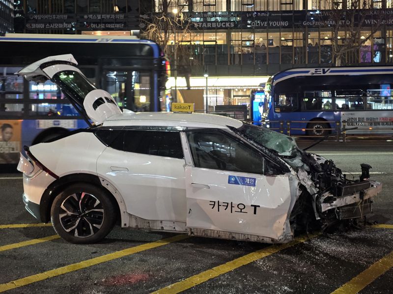 지난 2일 오후 6시5분께 서울 종로구 종각역 앞 도로에서 승용차 2대와 택시 1대가 추돌하며 1명이 숨지고 운전자를 포함해 14명이 다쳤다. 사진은 이날 사고를 일으킨 택시. 사진=서지윤 기자 |