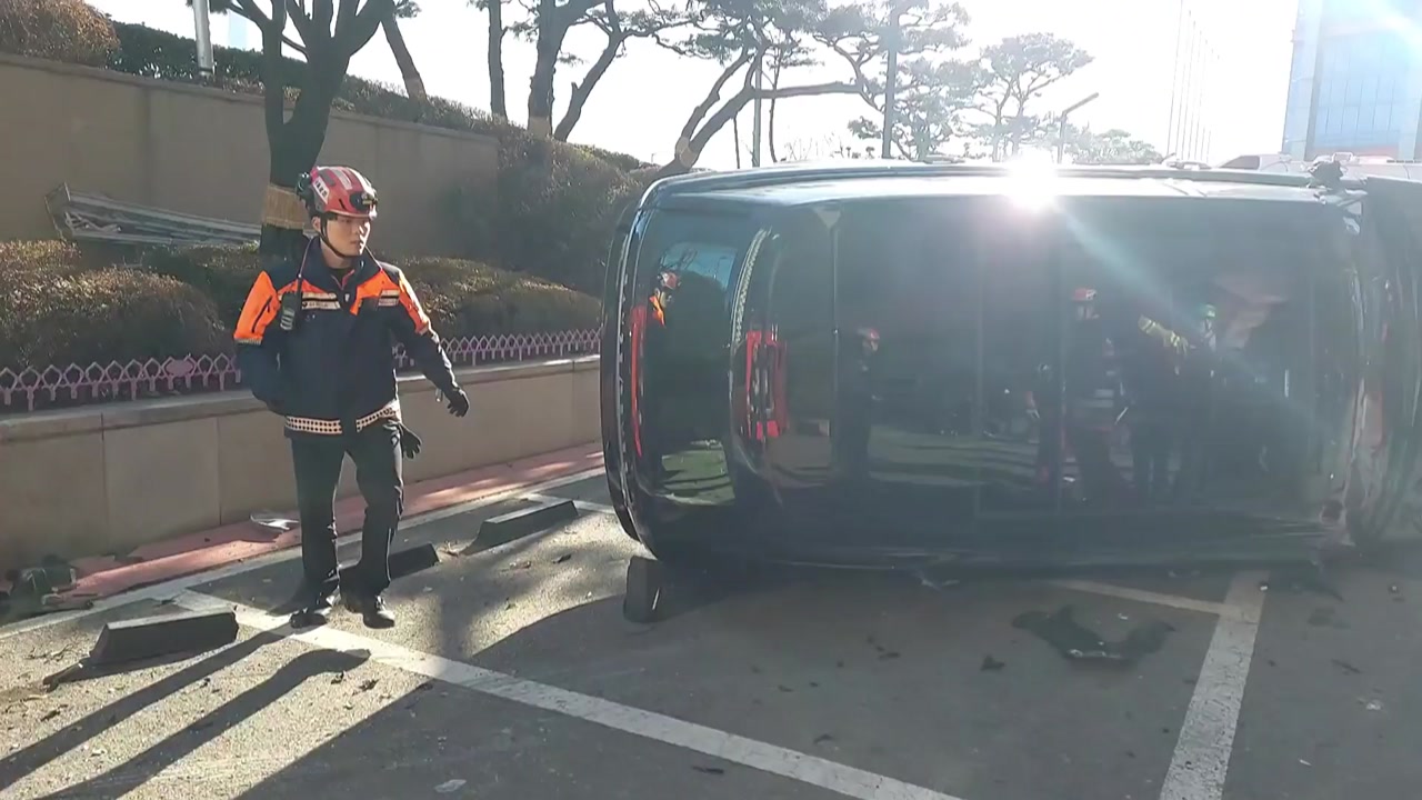 사고 충격으로 튕겨 나간 SUV가 근처 복합쇼핑몰 주차장에 떨어지면서 50대 남성 운전자가 다쳐 병원으로 옮겨졌습니다.