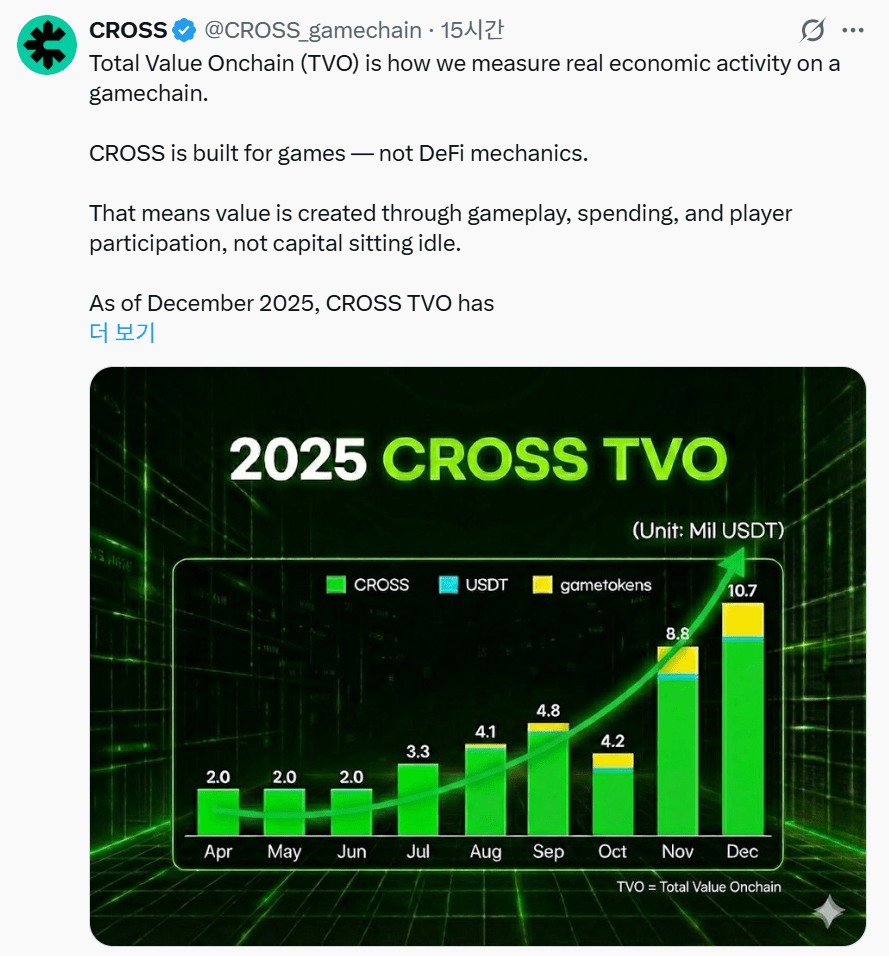 온체인 게임 플랫폼 크로쓰(CROSS)가 게임체인의 실질적인 성장을 나타내는 지표인 'TVO(온체인 총가치)'를 새롭게 발표했다.