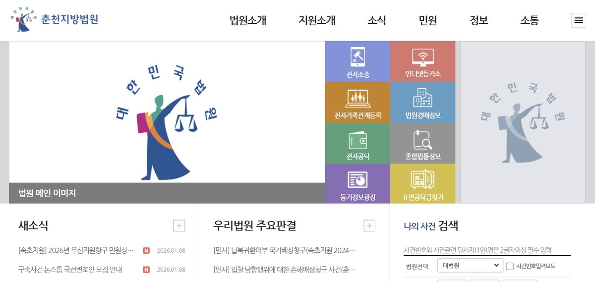 춘천지방법원 인터넷 홈페이지 초기 화면 갈무리. |