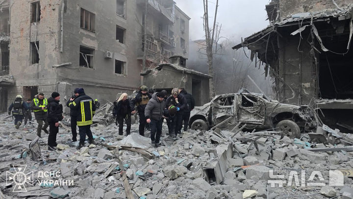 [AP/뉴시스] 지난 2일 우크라 북동부 하르키우시에 러시아 미사일이 날아와 집이 부서지고 사람들이 죽고 다쳤다 |