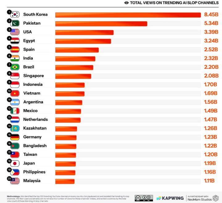 AI 영상 편집 플랫폼 카프윙(Kapwing)이 지난해 11월 국가별 인기 유튜브 채널 상위 100개를 분석해, AI 슬롭 콘텐츠를 게시하는 채널의 조회 수와 구독자 수를 집계한 결과, 한국 기반 AI 슬롭 채널의 누적 조회 수가 84억5000만 회로, 조사 대상 국가 중 가장 많았다.