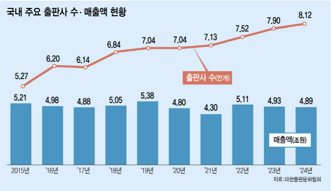 시장은 역성장을 하고 있는 반면, 출판사 수는 꾸준히 늘어나는 추세다. 출협이 발간한 ‘2024 한국출판연감’을 보면 2019년 처음 7만개를 넘어선 출판사 수(7만 416개)는 △2020년 7만 444개 △2021년 7만 1319개 △2022년 7만 5196개 △2023년 7만 9035개 △2024년 8만 1161개 등으로 증가세를 보였다.