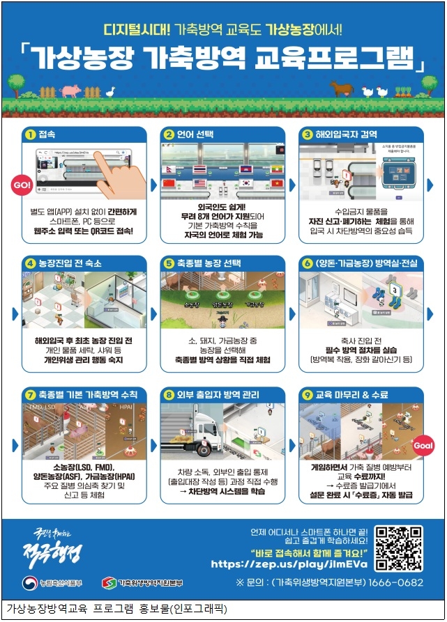 교육은 한국어를 포함해 영어·중국어·네팔어·태국어·캄보디아어·베트남어·미얀마어 등 총 8개 언어로 제공된다. 축산차량 소독, 장화 갈아신기, 외부인·외부차량 관리, 의심 증상 발견 시 신고 요령 등 기본 방역 수칙을 가상농장 안에서 영상과 미션 방식으로 익힐 수 있다. 공항·항만 입국 시 검역 준수 사항과 축종별(소·돼지·가금) 방역요령도 포함됐다.