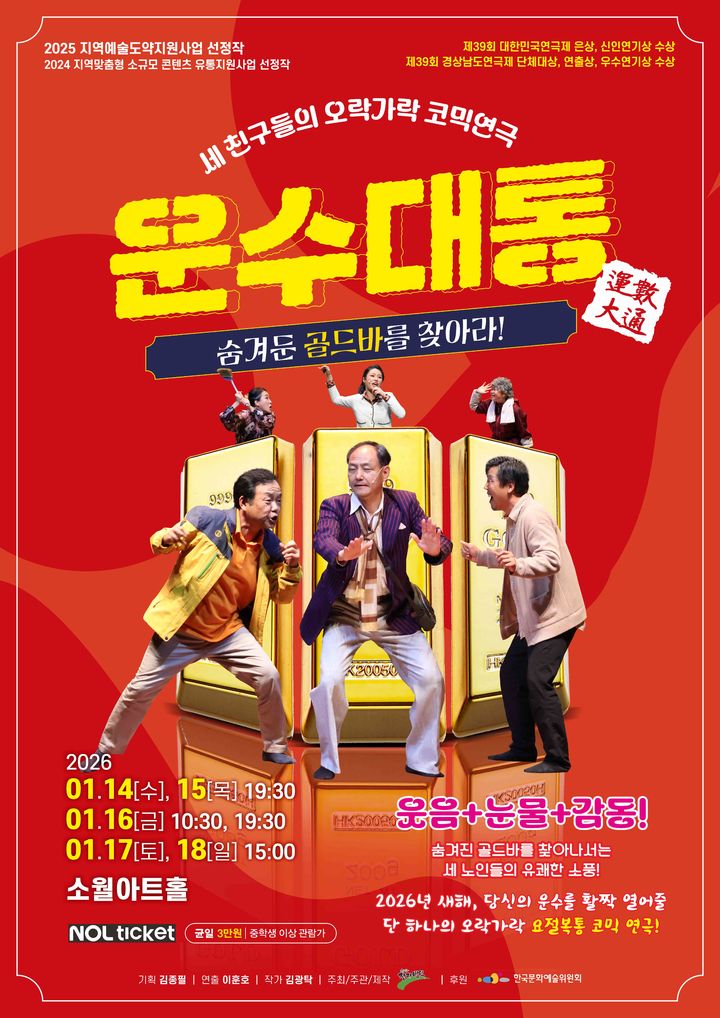 경남 사천을 거점으로 활동하는 극단 장자번덕의 '운수대통'은 제39회 대한민국연극제에서 단체 은상, 신인연기상 등을 수상한 바 있다. '2025 지역예술도약지원사업'에 선정돼 이번 서울 공연까지 선보이게 됐다.