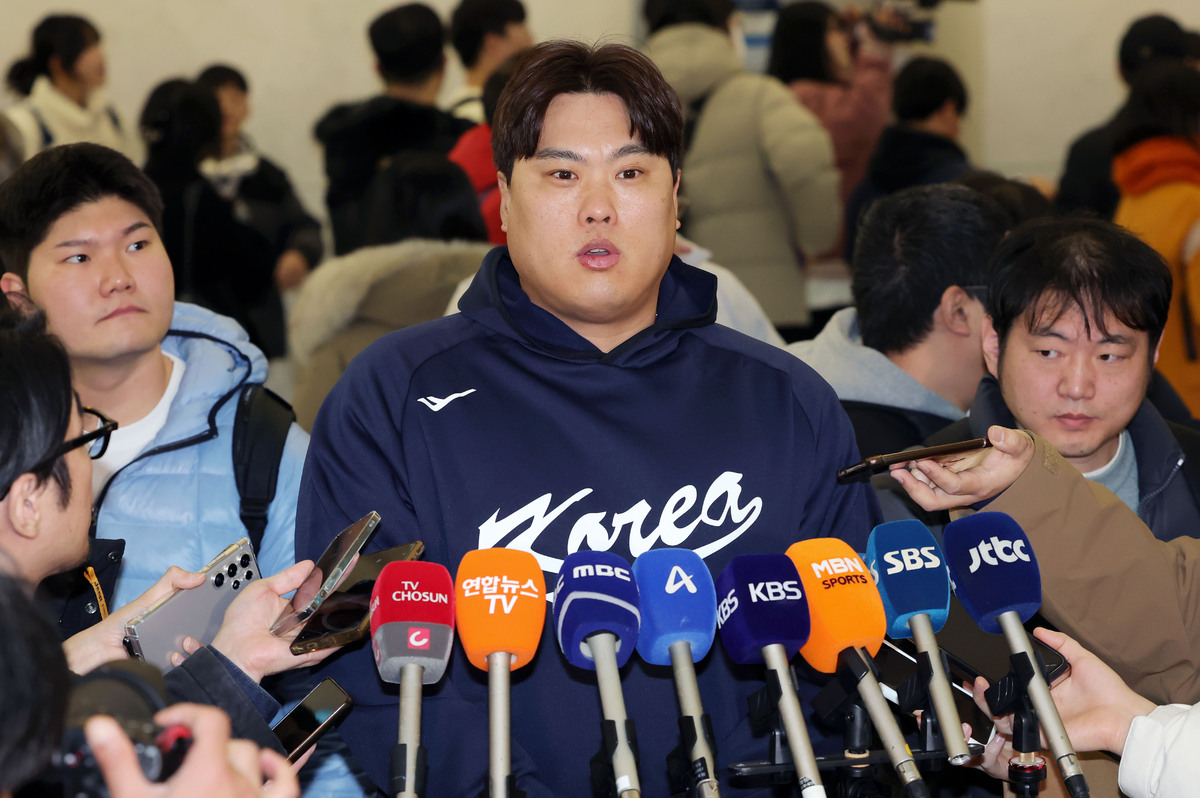 대한민국 야구국가대표팀 류현진이 9일 미국령 사이판에서 열리는 2026 월드베이스볼클래식(WBC) 1차 캠프 전지훈련에 참가하기 위해 인천국제공항 제1터미널에서 인터뷰하고 있다. 뉴시스 |