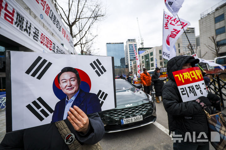 [서울=뉴시스] 정병혁 기자 = 12.3 비상계염 관련 내란 우두머리 혐의를 받는 윤석열 전 대통령의 결심공판이 진행 중인 가운데 9일 서울 서초구 서울중앙지방법원 앞에서 윤 전 대통령의 지지자들이 피켓을 들고 있다. 2026.01.09. jhope@newsis.com |
