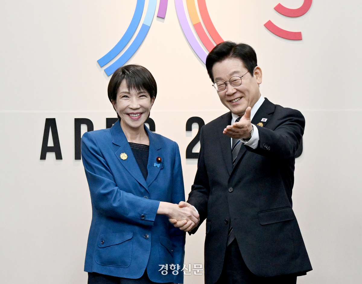 이재명 대통령이 2025년 10월 30일 경북 경주 아시아·태평양경제협력체(APEC) 정상회의장에서 다카이치 사나에 일본 총리와 양자 회담에 앞서 악수하고 있다. 김창길 기자 |