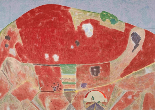 전통 한지인 장지 위에 동양화 분채와 안료를 혼합한 색을 수십 차례 쌓아 올리는 장지 채색 기법으로 시간의 결이 드러난다.