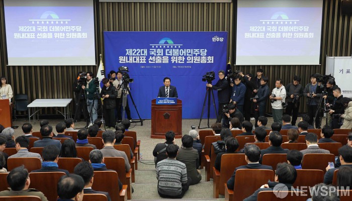 [서울=뉴스핌] 윤창빈 기자 = 정청래 더불어민주당 대표가 11일 서울 여의도 국회에서 열린 제22대 국회 더불어민주당 제2기 원내대표 선출 의원총회에서 모두발언을 하고 있다. 2026.01.11 pangbin@newspim.com