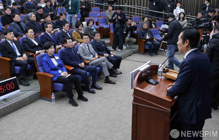 [서울=뉴스핌] 윤창빈 기자 = 정청래 더불어민주당 대표가 11일 서울 여의도 국회에서 열린 제22대 국회 더불어민주당 제2기 원내대표 선출 의원총회에서 모두발언을 하고 있다. 2026.01.11 pangbin@newspim.com