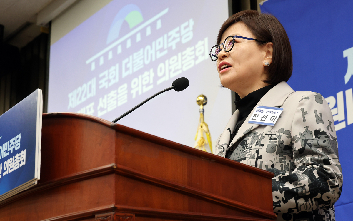 진선미 더불어민주당 중앙당선거관리위원장이 11일 국회에서 열린 제2기 원내대표 선출을 위한 의원총회에서 인사말을 하고 있다. 연합뉴스 |