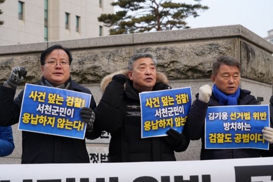 국민의힘 소속 김기웅 서천군수의 공직선거법 위반 과 관련해 더불어민주당 소속 서천군 지방의원들과 당원들이 12일 "검찰이 사건을 쥐고도 아무 것도 하지 않는 것은 명백한 직무유기"라며 즉각적인 처분을 촉구했다.