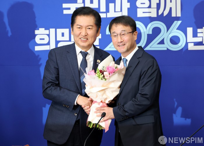 [서울=뉴스핌] 정일구 기자 = 정청래 더불어민주당 대표가 12일 오전 서울 여의도 국회에서 열린 최고위원회의에서 한병도 신임 원내대표에게 축하 꽃다발을 전달한 뒤 기념촬영을 하고 있다. 2026.01.12 mironj19@newspim.com