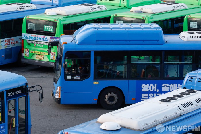 [서울=뉴스핌] 류기찬 기자 = 대법원의 통상임금 판결에 따른 임금 인상안을 두고 서울시버스운송사업조합(사측)과 대립해온 서울시버스노동조합(노조)이 파업 예고일을 하루 앞두고 막판 협상을 진행한다. 사측은 실무자급 협상에서 10.00%대 임금 인상률을 제안했고, 노조는 최소 12.85% 인상을 요구하고 있다. 사진은 12일 오전 서울 은평구 진관공영차고지에 버스가 주차되어 있다. 2026.01.12 ryuchan0925@newspim.com