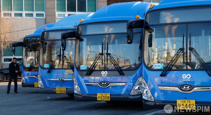 [서울=뉴스핌] 류기찬 기자 = 대법원의 통상임금 판결에 따른 임금 인상안을 두고 서울시버스운송사업조합(사측)과 대립해온 서울시버스노동조합(노조)이 파업 예고일을 하루 앞두고 막판 협상을 진행한다. 사측은 실무자급 협상에서 10%대 임금 인상률을 제안했고, 노조는 최소 12.85% 인상을 요구하고 있다. 사진은 12일 오전 서울 은평구 진관공영차고지에 버스가 주차되어 있다. 2026.01.12 ryuchan0925@newspim.com