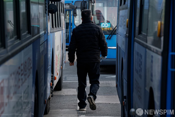 [서울=뉴스핌] 류기찬 기자 = 대법원의 통상임금 판결에 따른 임금 인상안을 두고 서울시버스운송사업조합(사측)과 대립해온 서울시버스노동조합(노조)이 파업 예고일을 하루 앞두고 막판 협상을 진행한다. 사측은 실무자급 협상에서 10%대 임금 인상률을 제안했고, 노조는 최소 12.85% 인상을 요구하고 있다. 사진은 12일 오전 서울 은평구 진관공영차고지에 버스가 주차되어 있다. 2026.01.12 ryuchan0925@newspim.com