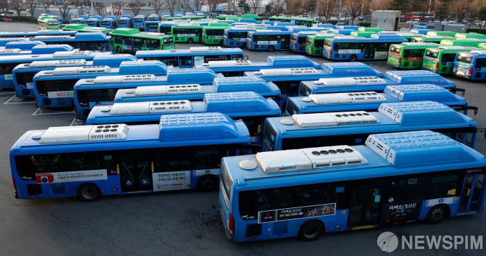 [서울=뉴스핌] 류기찬 기자 = 대법원의 통상임금 판결에 따른 임금 인상안을 두고 서울시버스운송사업조합(사측)과 대립해온 서울시버스노동조합(노조)이 파업 예고일을 하루 앞두고 막판 협상을 진행한다. 사측은 실무자급 협상에서 10%대 임금 인상률을 제안했고, 노조는 최소 12.85% 인상을 요구하고 있다. 사진은 12일 오전 서울 은평구 진관공영차고지에 버스가 주차되어 있다. 2026.01.12 ryuchan0925@newspim.com
