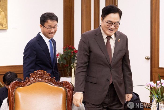 [서울=뉴스핌] 정일구 기자 = 우원식 국회의장(오른쪽)이 12일 오전 서울 여의도 국회 의장실에서 한병도 더불어민주당 신임 원내대표를 접견하고 있다. 2026.01.12 mironj19@newspim.com