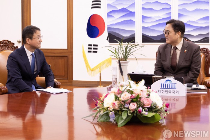 [서울=뉴스핌] 정일구 기자 = 우원식 국회의장(오른쪽)이 12일 오전 서울 여의도 국회 의장실에서 한병도 더불어민주당 신임 원내대표를 접견하고 있다. 2026.01.12 mironj19@newspim.com